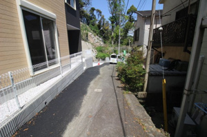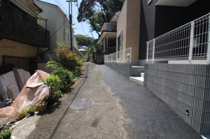 道幅が狭く車の侵入はできませんが、道路との高低差の無い敷地です。