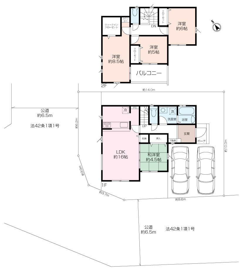 角地(南西 公道 6.5m 間口 9.6m)(北西 公道 6.5m 間口 6.2m) |